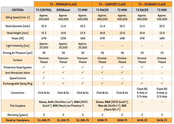 To accomadate taste and affordability Sirona has 3 Handpiece Classes: